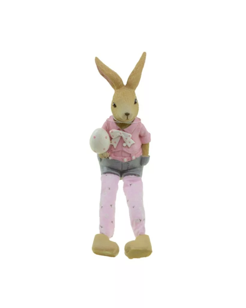 Dekoratív lógólábú fiú nyuszi figura rózsaszín ruhában, tökéletes választás húsvéti és tavaszi dekorációhoz. Polcra, komódra vagy ablakpárkányra helyezve kedves, ünnepi hangulatot teremt.