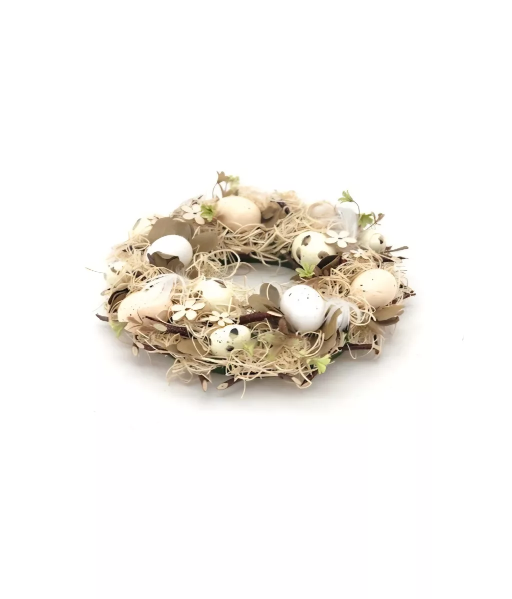 Természetes hatású, 28 cm átmérőjű natúr koszorú finom krém színű tojásdíszítéssel. Letisztult, harmonikus megjelenése tökéletes választás húsvéti és tavaszi dekorációként ajtóra, falra vagy akár asztali középdísz alapjaként.