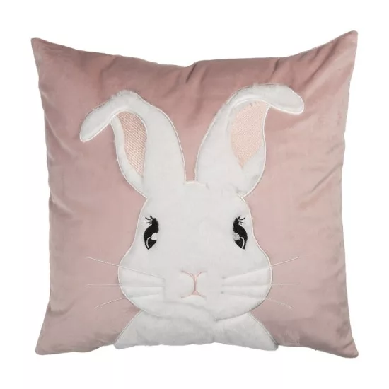 Bájos nyuszis párnahuzat fehér plüssnyuszi motívummal, amely puha, meghitt hangulatot teremt a nappaliban vagy a gyerekszobában. A pasztell árnyalatú háttér és a térbeli hatású plüss díszítés igazán különlegessé teszi.
